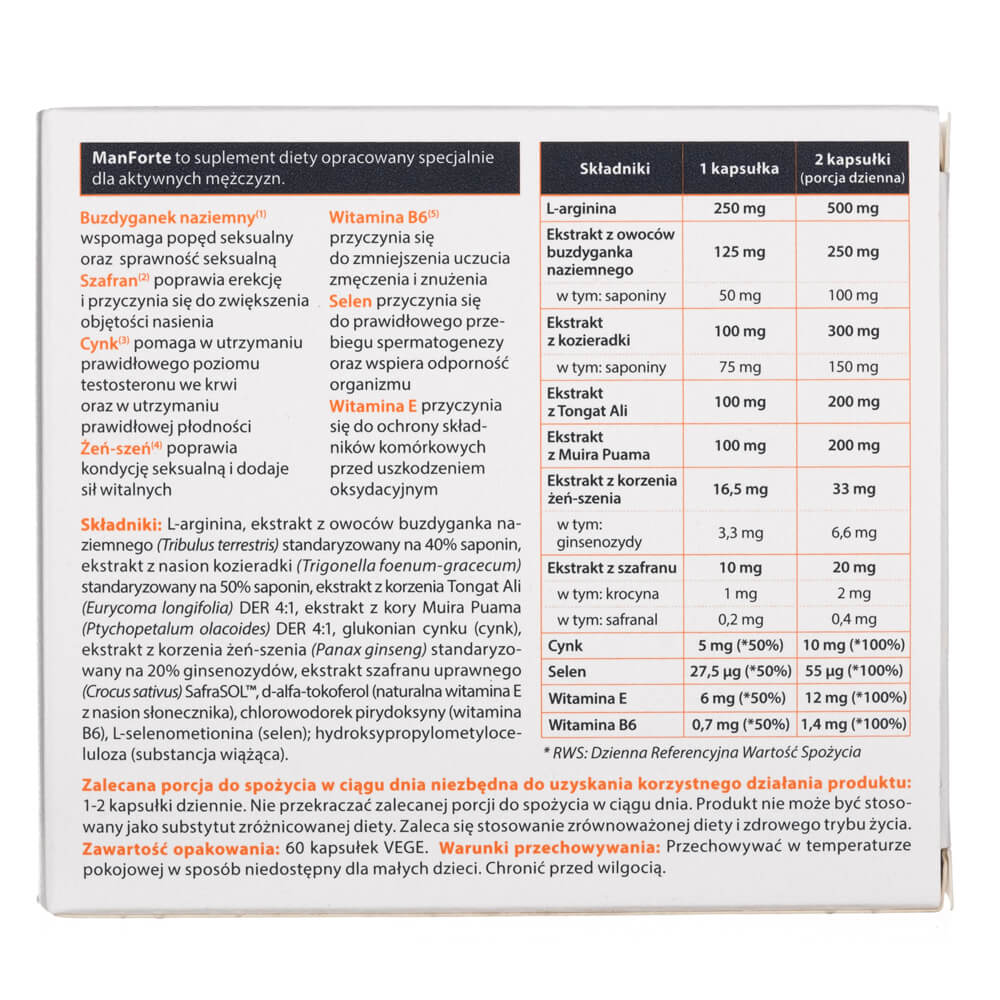 Le complément alimentaire ManForte contient une grande part de L-arginine, extrait de macis - qui soutient le désir et les performances sexuelles, extrait de ginseng - qui aide à maintenir une endurance optimale, la vitalité et le bien-être physique et mental. La nouvelle formule de ManForte est également enrichie d'extraits de fenugrec et de safran, qui améliorent l'érection et contribuent à augmenter le volume du sperme.