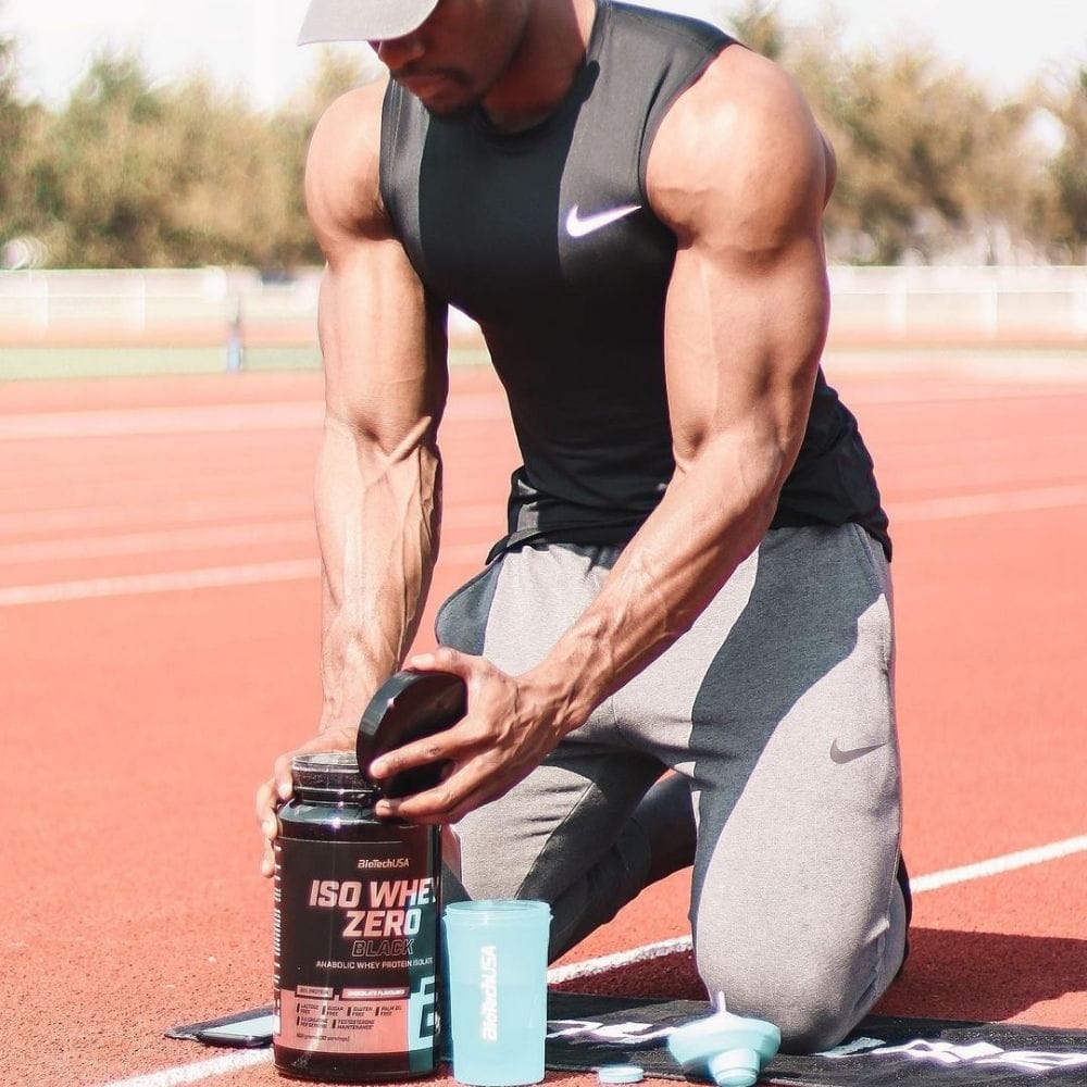 Boisson en poudre à base d'isolat de lactosérum avec une teneur en protéines de 90 pour cent, avec ajout de créatine, d'acides aminés, de chélate de zinc et de vitamine B3.