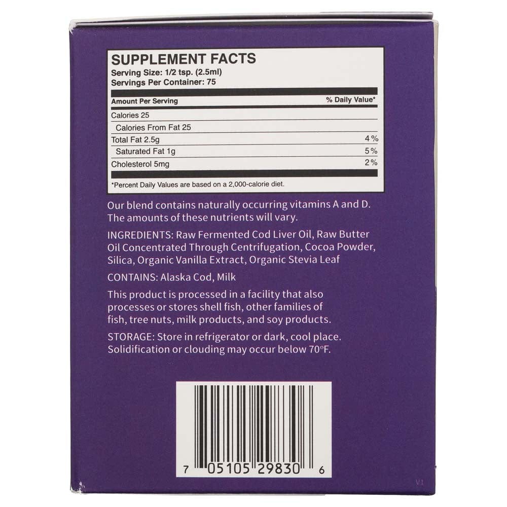 RAW Huile de foie de morue fermentée, RAW Huile de beurre concentrée par centrifugation, Poudre de cacao, Extrait de vanille biologique, Silice, Feuille de stévia biologique .