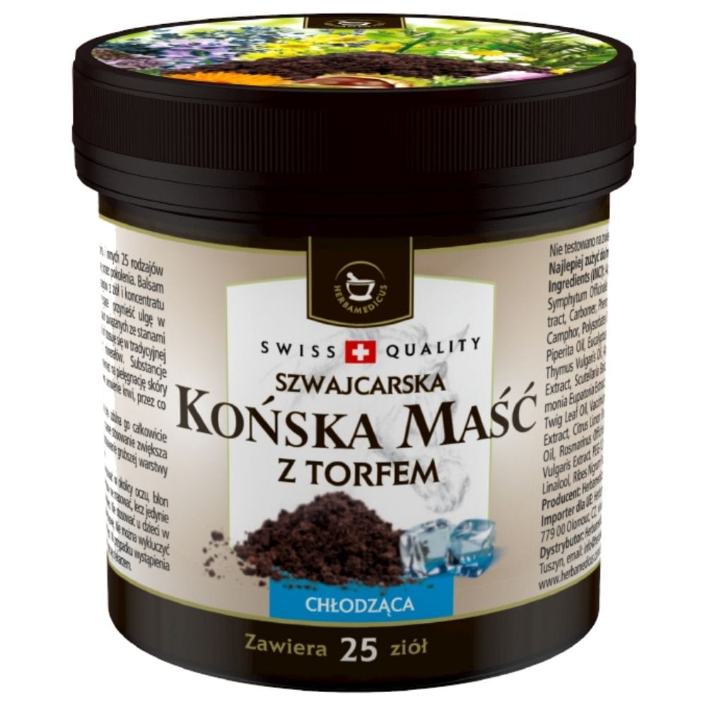 Herbamedicus Horse Ointment with Peat Cooling est un baume à base de plantes unique créé à partir de tourbe de haute qualité et de 25 extraits de plantes . La formule, basée sur une recette traditionnelle, procure une sensation de fraîcheur immédiate et soulage la douleur.