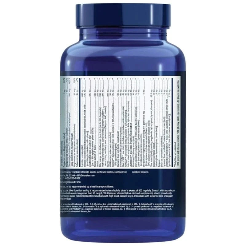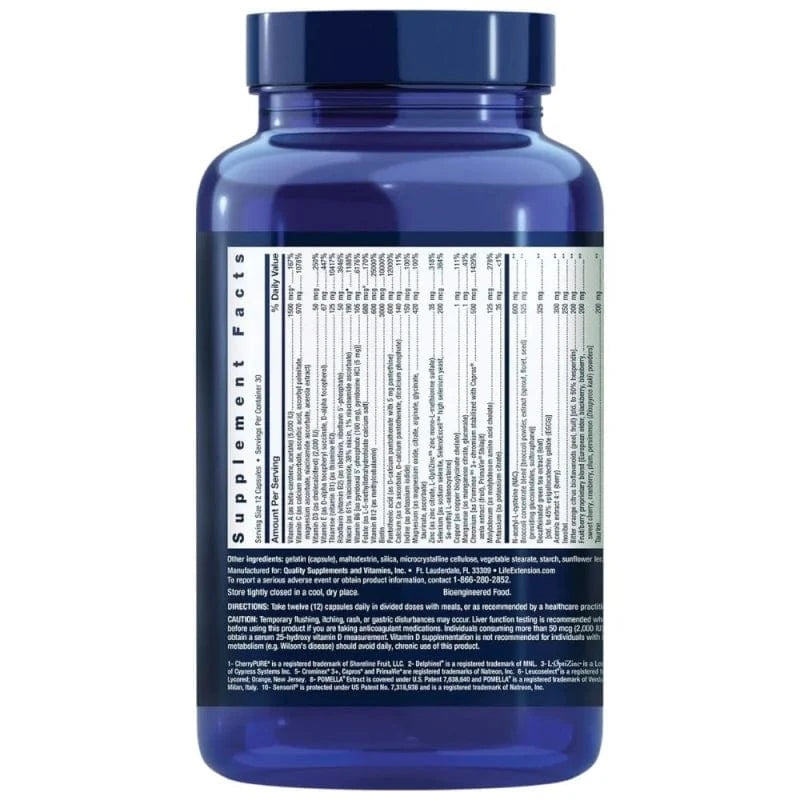 Vitamine A (en tant que bêta-carotène, acétate) (5000 IU), Vitamine C (sous forme d'ascorbate de calcium, acide ascorbique, palmitate d'ascorbyle, ascorbate de magnésium, ascorbate de niacinamide, extrait d'acérola), Vitamine D3 (sous forme de cholécalciférol) (2000 UI.), Vitamine E (sous forme de succinate de D-alpha tocophéryl, D-alpha tocophérol), Thiamine (vitamine B1) (sous forme de chlorhydrate de thiamine), Riboflavine (vitamine B2) (sous forme de riboflavine, Riboflavine 5'- phosphate) (sous forme de chlorhydrate de thiamine), Riboflavine 5'- phosphate), Riboflavine 5'- phosphate),phosphate), Vitamine B6 [sous forme de pyridoxal 5'-phosphate (100 mg), pyridoxine HCI (5 mg) ], Folate (sous forme de sel de calcium de L-5-méthyltétrahydrofolate), Vitamine B12 (sous forme de méthylcobalamine), Biotine, Acide pantothénique (sous forme de D-pantothénate de calcium avec 5 mg de pantéthine), Calcium (sous forme d'ascorbate de calcium, D-pantothénate, phosphate dicalcique), Iode (sous forme d'iodure de potassium), Magnésium (sous forme d'oxyde de magnésium, citrate, arginate, glycinate, taurate, ascorbate), Zinc (sous forme de citrate de zinc, L-OptiZinc ® 3 sulfate de zinc mono-L-méthionine), Sélénium [sous forme de sélénite de sodium, SelenoExcell ® 4 levure à haute teneur en sélénium, Se-méthyl-L-sélénocystéine], Cuivre [sous forme de chélate de bisglycinate de cuivre], Manganèse (sous forme de citrate de manganèse, gluconate de manganèse), Chrome [sous forme de Crominex ® chrome 5 3+ stabilisé avec Capros ® extrait d'amla (fruit), PrimaVie ® Shilajit], Molybdène (sous forme de chélate d'acide aminé de molybdène), Potassium (sous forme de citrate de potassium), Mélange de concentré de brocoli [poudre de brocoli poudre, extrait (germes, inflorescences, graines) (apportant des glucosinolates, sulforaphane) ], N-acétyl-L-cystéine (NAC), Extrait de thé vert décaféiné (feuille) [std. jusqu'à 45% de gallate d'épigallocatéchine (EGCG) ], Extrait d'acérola 4:1 (baies), Inositol, Bioflavonoïdes d'agrumes provenant de l'écorce d'orange amère (, fruit) [std. jusqu'à 50% d'hespéridine], Mélange exclusif de fruits et de baies [sureau, mûre, myrtille, cerise, canneberge, prune, kaki (Diospyros kaki) poudre], Taurine, Extrait d'anthocyanine de myrtille sauvage (fruit), Sensoril ® 10 Extrait d'ashwagandha (racine, feuille) [std. jusqu'à 32% d'oligosaccharides,10% de conjugués glycosidiques], Silymarine [de l'extrait de chardon-Marie (graine) ], Triméthylglycine (TMG) (sous forme de bétaïne anhydre), CherryPure ® 1 extrait de proanthocyanidine (écorce), POMELLA ® 8 extrait de grenade (fruit) [std. jusqu'à 30% de punicalagines], Mélange naturel de tocophérols (fournissant des gamma, delta, alpha, beta tocophérols), MirtoSelect ® 9 extrait de myrtille (fruit), Leucoselect ® 6 extrait de proanthocyanidine de pépins de raisin, Bio-Quercétine ® Mélange exclusif apportant 35% de quercétine (5 mg) [du sophora japonais concentré (bourgeon floral) ],30% de galactomannanes (4 mg) [du fenugrec (graine) ] 15 mg, Broméline [de l'ananas (tige) ] (2400 unités digestives de gélatine/gramme), Lutéine [de l'extrait de souci (fleur) ] (fournissant 465 mcg de trans-zéaxanthine), Extrait d'olive (fruit) (apportant des polyphénols, hydroxytyrosol, tyrosol, oleuropéine), Extrait de lignanes de graines de sésame, Lutéoline [de bourgeons de fleurs de sofora japonais () ], Apigénine, Bore (comme chélate d'acide aminé du bore), Lycopène [de LycoBeads ® 7 extrait naturel de tomate (fruit) ], Delphinidine [de Delphinol ® 2 extrait de baies de maqui (Aristotelia chilensis) (fruit) ], Cyanidine 3-glucoside (C3G) [de l'extrait de cassis (fruit) ], Gélatine (capsule), Agents de charge : maltodextrine, silice, cellulose microcristalline, stéarate végétal, amidon, lécithine de tournesol, huile de tournesol.