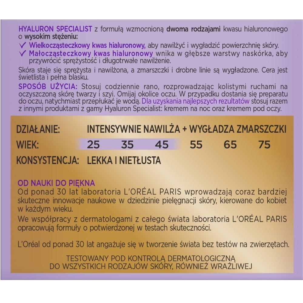 La crème de jour hydratante Hyaluron Specialist est un produit innovant développé par les Laboratoires L'Oréal Paris dans le cadre de son soin hydratant réparateur. Elle répond aux besoins des femmes qui souhaitent conserver une peau jeune et fraîche, en luttant efficacement contre les premiers signes de l'âge et en assurant une protection contre les rayons nocifs du soleil.