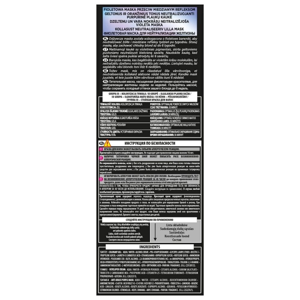 Gel de coloration : Aqua/Water, Trideceth-2 Carboxamide Mea, Propylene Glycol, Hexylene Glycol, PEG-2 Oleamine, Polyglyceryl-4 Oleyl Ether, Oleyl Alcohol, Alcohol Denat., Hydroxyde d'ammonium, Polyglyceryl-2 Oleyl Ether, Acide oléique, Sodium Diethylaminopropyl Cocoaspartamide,2,4-Diaminophenoxyethanol HCl, m-Aminophenol,2-Amino-3-Hydroxypyridine, Sodium Metabisulfite, Hydroxypropyl Bis (N-Hydroxyethyl-P-Phenylenediamine) HCl, Eugenol, Ammonium Acetate, Linalool, p-Phenylenediamine, Alpha-Isomethyl Ionone, Resorcinol, EDTA, Citronellol, Erythorbic Acid, Parfum/Fragrance. (FIL C201769/1).