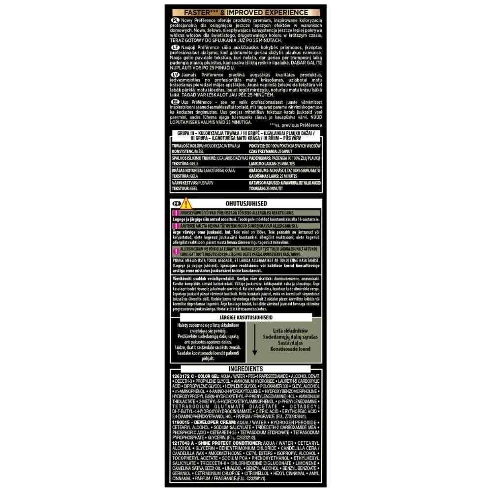 L'Oréal Paris Preference est une coloration permanente innovante avec un système anti-fade. La nouvelle formule gel avec huile procure jusqu'à 8 semaines de couleur, intense et brillante et jusqu'à 100% de couverture des cheveux gris. Le produit offre des résultats professionnels à domicile, est prêt à être rincé en seulement 25 minutes et contient un revitalisant protecteur de brillance enrichi d'un filtre UV et d'un dérivé de vitamine E.