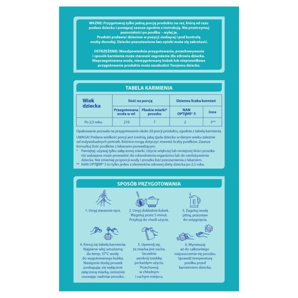 Nestlé NAN OPTIpro 5 est un produit à base de lait destiné aux jeunes enfants de plus de 2,5 ans. Enrichi en vitamines et minéraux. Il ne remplace pas le lait maternel, mais est un produit conçu pour faciliter la composition adéquate de l'alimentation d'un enfant.