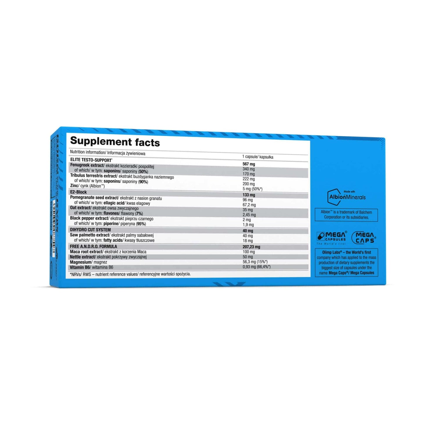 Extrait de graines de fenugrec (Trigonella foenum-graecum L.), Extrait de fruit de Tribulus terrestris (Tribulus terrestris L. ; 90% de saponines), Extrait de racine de maca (Lepidjum meyenii Walp.), Malate de magnésium, Extrait de graines de grenade (Punica granatum L.), Extrait de fruit de Tribulus terrestris (Tribulus terrestris L. ; 60% de saponines), agent de charge — cellulose microcristalline ; extrait d'ortie (Urtica dioica L.), extrait de fruit de palmier nain (Serenoa repens), extrait d'avoine (Avena sativa L.), anti-agglomérants — sels de magnésium d'acides gras, dioxyde de silicium ; bisglycinate de zinc (chélate d'acides aminés de zinc Albion™), extrait de fruit de poivre noir (Piper nigrum L.), chlorhydrate de pyridoxine — vit. B6, capsule (gélatine, colorant : E 132).