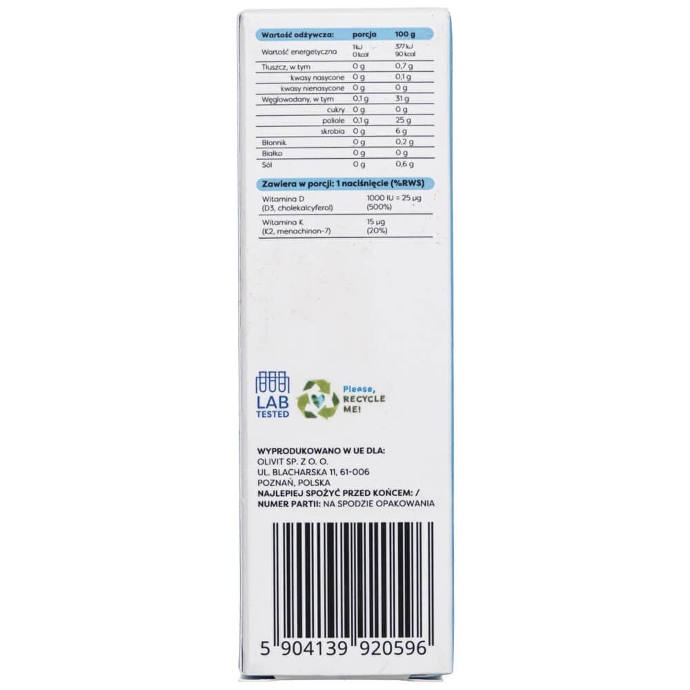 Complément alimentaire contenant de la vitamine D3 (cholécalciférol) et de la vitamine K2 (ménaquinone-7). Spray buccal contenant du xylitol (avec édulcorants) et arôme naturel de menthe poivrée.