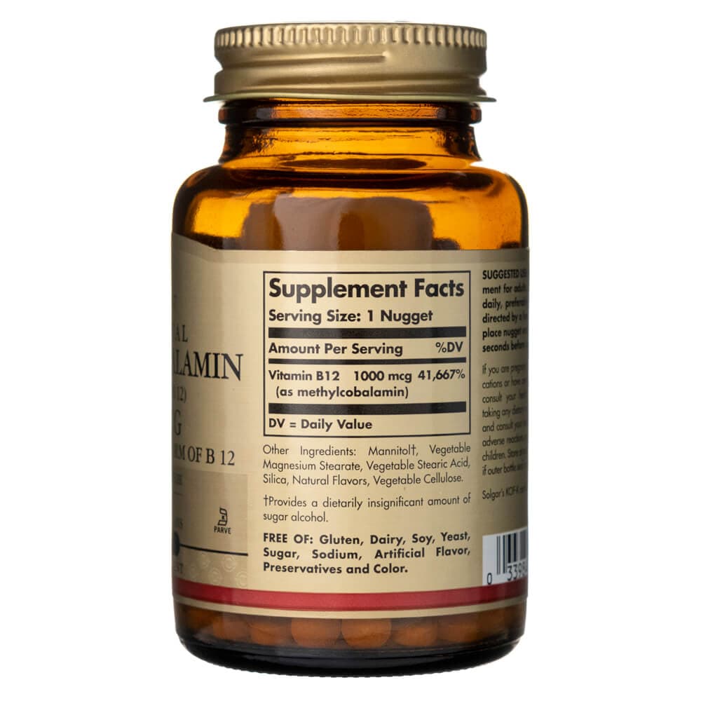 Solgar ® Les pépites de méthylcobalamine contiennent une forme active de vitamine B12 prête pour le corps. Les travailleurs postés, les étudiants universitaires, les mères et les personnes âgées peuvent utiliser ce complément pour soutenir le métabolisme énergétique.