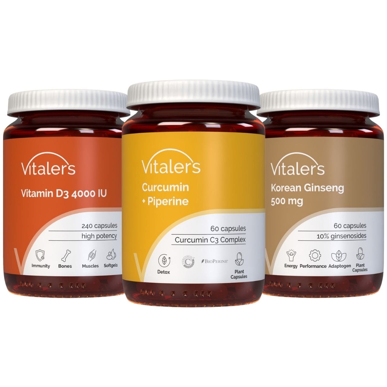 Vitaler's Spring Awakening est une combinaison de trois compléments qui vous aideront à vous sentir plein d'énergie après les mois d'hiver. Korean ginseng améliore la concentration et booste l'énergie, vitamine D3 soutient le système immunitaire et la santé des os, et curcumine avec pipérine a un effet anti-inflammatoire et soutient les articulations. L'ensemble du set a un effet global, qui apporte un soutien naturel au quotidien, en particulier pendant les périodes de transition.